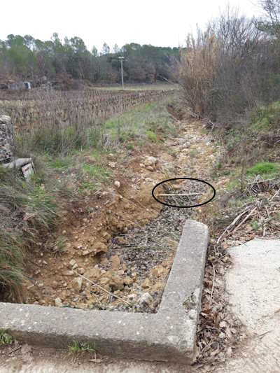 Compte tenu de sa localisation en travers d’un ruisseau, celle ci a été noyée dans un bloc de ciment pour la protéger.