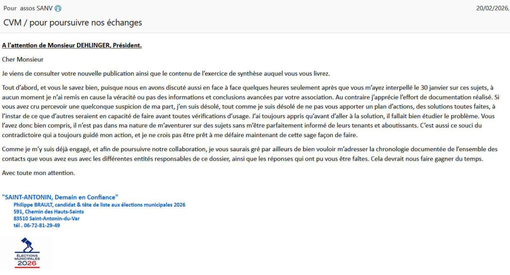 M. Philippe BRAULT, tête de liste de « SAINT‑ANTONIN, Demain en Confiance », nous a adressé le courriel suivant :
